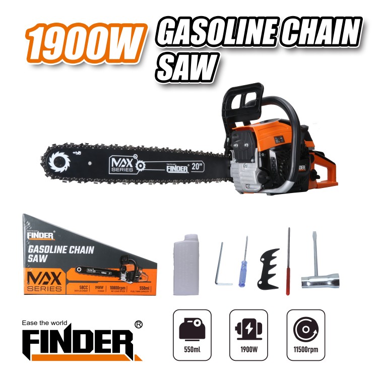 Βενζινοκίνητο αλυσοπρίονο από την νέα σειρά Max Series της Finder. O δίχρονος κινητήρας Finder εξασφαλίζει υψηλή ισχύ και αντοχή με εξαιρετική ροπή στρέψης που το καθιστά ιδανικό για κόψιμο κορμών δέντρων, μεγάλων κλαδιών και ξύλων. Απλός χειρισμός, λειτουργία και σταμάτημα, ελέγχονται με έναν μόνο μοχλό. Αυτό κάνει τον χειρισμό εξαιρετικά εύκολο και ασφαλή, καθώς ο χειριστής δεν χρειάζεται να απομακρύνει το χέρι του από τη λαβή.Σύγχρονος εργονομικός σχεδιασμός, υψηλής απόδοσης και αντοχής, με πολλές δυνατότητες χρήσης.Τεχνικά χαρακτηριστικά:Αερόψυξη/Air-Cooling, Μονοκύλινδρο/Single Cylinder, Δίχρονο/Two StrokeΚυβισμός: 52 ccΜέγεθος: 20″Ισχύς: 1900W/2.5HPΤαχύτητα: 11.500 RPMΥλικό λεπίδας: ατσάλι – SteelΑναλογία ανάμειξης καυσίμου: 1:25Χωρητικότητα δοχείου καυσίμου: 550 mlΧωρητικότητα δοχείου λαδιού: 260 mlΒάρος: 6kgΤάση: 220-240V, 50/60HZ Η FINDER TOOLS είναι ένας ταχέως αναπτυσσόμενος προμηθευτής με μεγάλη τεχνολογική εμπειρία στην κατασκευή εργαλείων. Παράγει Α’ ποιότητας εργαλεία που σε συνδυασμό με την χαμηλή τιμή και την υψηλή ποιότητα κατασκευής βρίσκεται στις πρώτες θέσεις προτίμησης τόσο για τους λάτρεις του DIY όσο και για τους τεχνίτες που αναζητούν την επαγγελματική ποιότητα στην πιο οικονομική επιλογή!