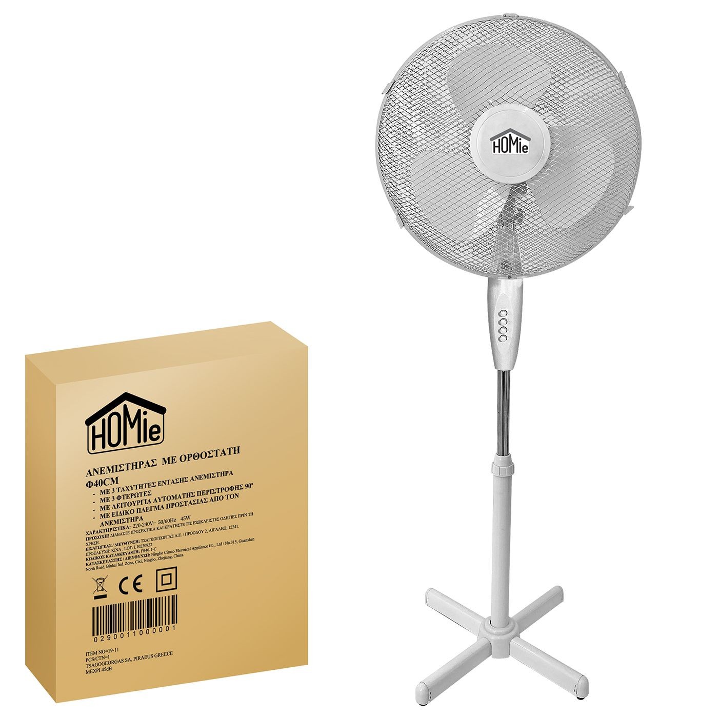 3 ταχύτητες έντασης, με αυτόματη περιστροφή 90o,45watt. Απαιτεί συναρμολόγηση Φ40cm, H:130cm