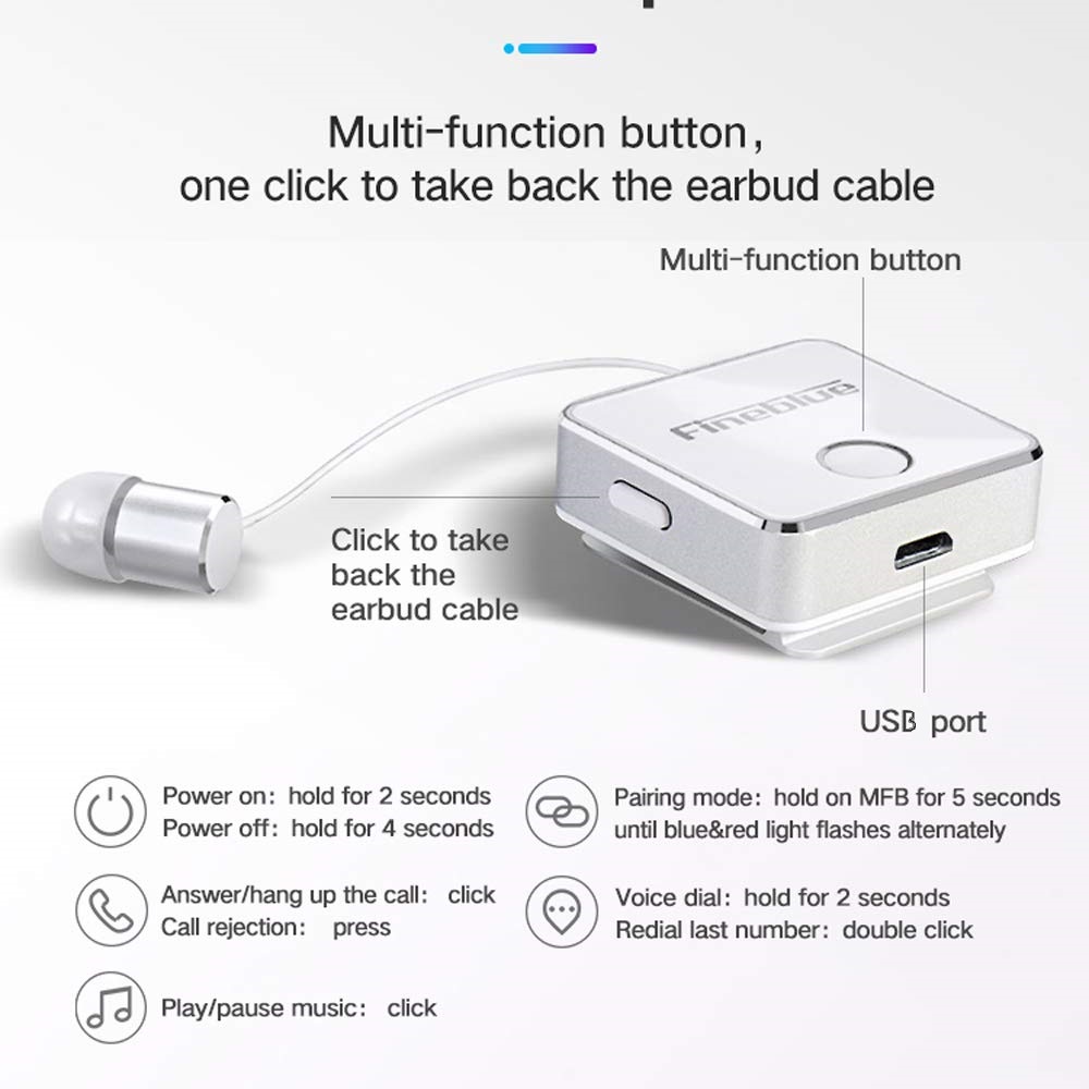 Ακουστικό Handsfree Bluetooth Fineblue με τεχνολογία Noise cancellation για ελαχιστοποίηση θορύβων και απόλυτη ηχομόνωση. Με δόνηση, κλιπ πέτου (clip-on colar) και επεκτεινόμενο καλώδιο. Ασύρματο, διακριτικό και πρακτικό, με εξαιρετικό ήχο και ιδιαίτερα ανθεκτική κατασκευή.Χαρακτηριστικά:Πλήκτρο αυτόματης επανατύλιξης καλωδίουBluetooth: V5.0Εμβέλεια: 10 μέτραBluetooth protocol: A2DP, AVRCPΤεχνολογία Noise cancellationΦωτεινη λυχνία για να βλέπεις τη στάθμη της μπαταρίας Ειδοποίηση με δόνησηΤύπος: In-EarΕνσωματωμένο μικρόφωνοΠλήκτρο για άμεση απάντηση σε κλήσηΥποστήριξη ταυτόχρονης σύνδεσης 2 συσκευώνΘύρα φόρτισης Micro USB (περιλαμβάνεται καλώδιο φόρτισης USB)Τάση φόρτισης: 5VΕνσωματωμένη επαναφορτιζόμενη μπαταρία: 95mAh Li-ion batteryΧρόνος φόρτισης: 2 ώρεςΧρόνος χρήσης: έως 6 ώρεςΧρόνος αναμονής: έως 150 ώρεςΣυχνότητα: 50ΚHz-20ΚHzTransmitter frequency: Class 2 (-6dBm ~ 4dBm)Αντίσταση: 16Ω ± 15%Ευαισθησία: 95dB ± 3dBΕυαισθησία μικροφώνου: -42±3dBΥλικά κατασκευής: Αλουμίνιο, ABS + TPEΔιαστάσεις ακουστικού: 36*36*12mmΒάρος: 19,4 g.Περιλαμβάνονται: 3 x Tips σιλικόνης (S, M, L)Οδηγίες χρήσης στα Αγγλικά