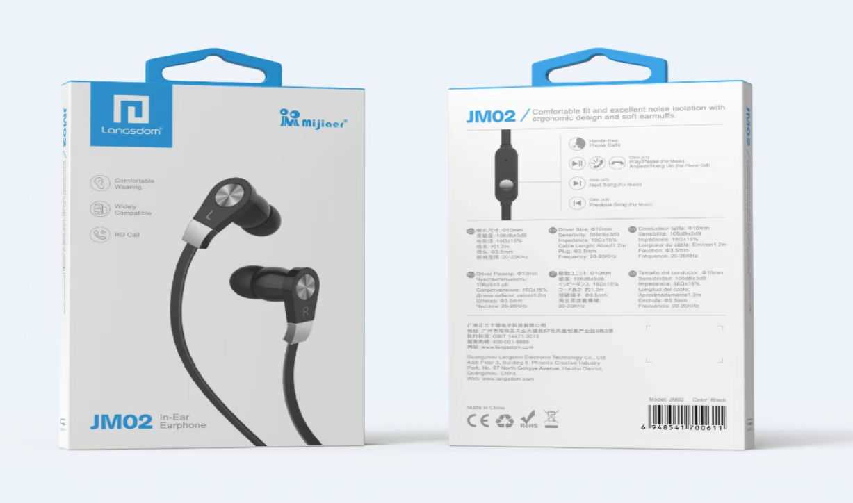 Ενσύρματα ακουστικά Langsdom με στερεοφωνικό ήχο υψηλής ποιότητας, τεχνολογία ελαχιστοποίησης εξωτερικών θορύβων και ελαφρύ εργονομικό σχεδιασμό για άνετη πολύωρη χρήση. Διαθέτουν πλήκτρο/ελεγκτή και ενσωματωμένο μικρόφωνο για την άμεση απάντηση στις κλήσεις σας χωρίς να χρειάζεται να απαντήσετε από το smartphone σας.Χαρακτηριστικά: Σύνδεση Jack 3.5mm – Συμβατά με όλα τα κινητά τηλέφωνα και άλλες ηλεκτρονικές συσκευές που διαθέτουν θύρα Jack.Τοποθέτηση In-ear με ωτοασπίδα σιλικόνης,Μέγεθος ηχείου ακουστικού: 10mm,Αντίσταση: 32Ω±15%Ευαισθησία: 108±3dB Max.Output Power: 6mW Εύρος συχνότητας:  100~10KHZ ΜικρόφωνοΜήκος καλωδίου: 1.2m.