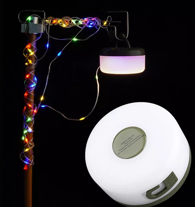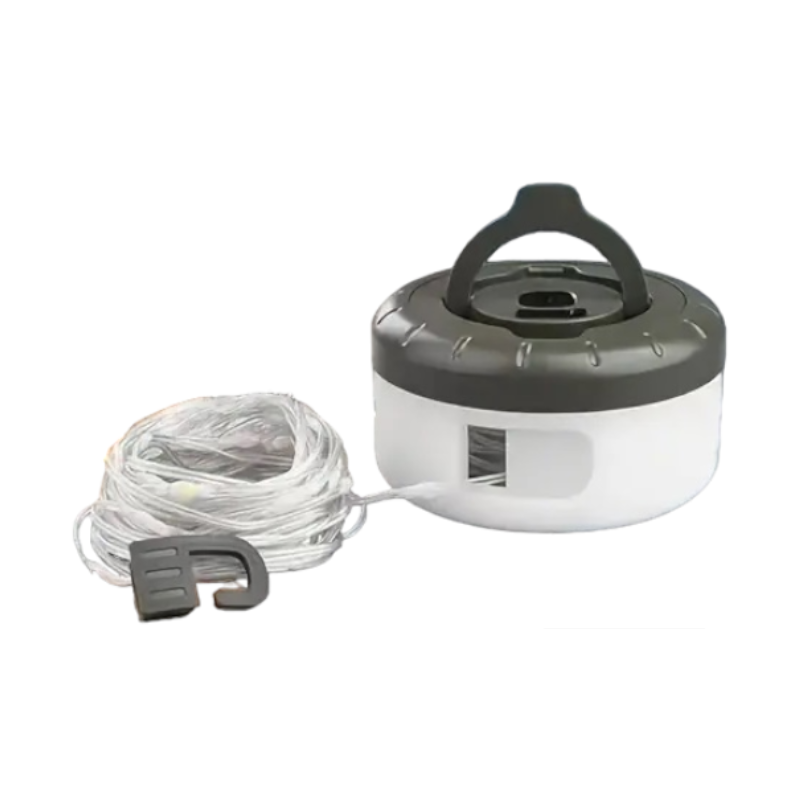 Επαναφορτιζόμενη λάμπα LED σετ με γιρλάντα φωτισμού που συνδέεται και τροφοδοτείται από την λάμπα, με πολύχρωμο φωτισμό RGB. Ιδανική για διακόσμηση εξωτερικών χώρων ή πρακτική χρήση στο κάμπινγκ και τις υπαίθριες δραστηριότητες σας. Η λάμπα διαθέτει αυτόνομο φωτισμό και η γιρλάντα μαζεύεται σε ρολό εντός της λάμπας προσδίδοντας έξτρα εφέ.Χαρακτηριστικά: 2 λειτουργίες φωτισμού: σταθερό + flashing, 3 επίπεδα έντασης φωτισμού, Διαστάσεις λάμπας: 9×4.5cm, Πτυσσόμενο σταντ στήριξης και κρεμάστρα, Επαναφορτιζόμενη μπαταρία 1800 mAh, Lumen:200, Χρόνος φόρτισης: 3 ώρες, Αυτονομία έως 4 ώρες, Στεγανοποίηση IP67 , Μήκος γιρλάντας 8m, Διαφανές καλώδιο. *Χρώμα φωτισμού: Πολύχρωμο RGB