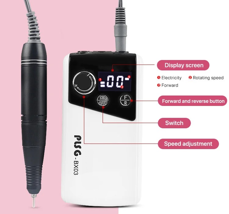 Επαγγελματικός, επαναφορτιζόμενος τροχός μανικιούρ-πεντικιούρ με βάση στήριξης για το στυλό. Διαθέτει ρυθμιζόμενη ταχύτητα, λειτουργία μειωμένου θορύβου και δονήσεων και εργονομικό σχεδιασμό για εύκολη και άνετη χρήση.Χαρακτηριστικά: Ισχύς: 20W Ψηφιακή οθόνη LCD, Χωρητικότητα μπαταρίας: 2500mah,Αυτονομία έως 5 ώρες, Χρόνος φόρτισης: 5 ώρεςΔεξιόστροφη και αριστερόστροφη λειτουργία, Τάση: 12V, Ταχύτητα: ρυθμιζόμενη έως 35.000 rpm, Διαστάσεις: 7*2,5*13cm.