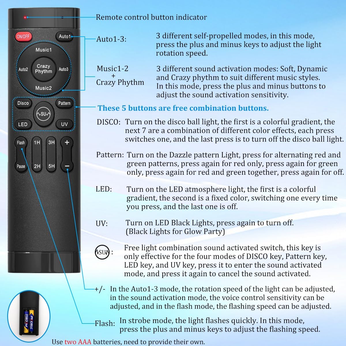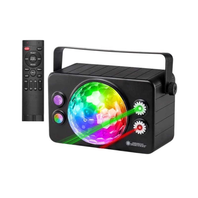 Φωτορυθμικό LED Disco Light με πολύχρωμο φωτισμό RGB και εντυπωσιακά προγράμματα, με τηλεχειριστήριο πλήρους χειρισμού και πρακτικό μέγεθος που μπορεί να τοποθετηθεί παντού. Δημιουργείστε την πιο εντυπωσιακή ατμόσφαιρα για το πάρτυ σας ή χρησιμοποιήστε το για διακοσμητικό φωτισμό του χώρου σας.Κατάλληλο και για επαγγελματική χρήση. Χρησιμοποιεί ισχυρής φωτεινότητας RGB LEDs, τοποθετημένα πάνω σε περιστρεφόμενη βάση.Τοποθετείται επιτραπέζια ή κρεμαστό από οροφή χάρη στις ειδικές εσοχές για βίδωμα.Τροφοδοσία ρεύματος με τροφοδοτικό πρίζας (περιλαμβάνεται).Τηλεχειριστήριο (λειτουργεί με 2 μπαταρίες AAA – δεν περιλαμβάνονται)Ισχύς: 10WΤάση λειτουργίας: 5V DCΔιαστάσεις : 21 x 16 x 13cmΒάρος: 700gΠιστοποίηση CE, ROHS.