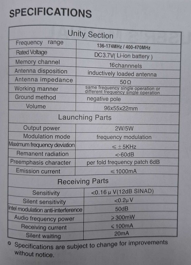 ΧΑΡΑΚΤΗΡΙΣΤΙΚΑ: Έξοδος: ≤ 5W Συχνότητα: 136-174MHz / 400-470.MHzΜπαταρία 4.2V 6800mah16 κανάλιαΑντίσταση κεραίας 50ΩΕξοικονόμηση μπαταρίας Λειτουργία VOX (Voice Operated Transmitting).Προειδοποίηση χαμηλής μπαταρίας Προστασία υπέρτασης ή χαμηλής τάσης Παρακολούθηση καναλιού TOT (Time-out Timer)Τεχνολογία μείωσης θορύβου Λειτουργία σάρωσηςΔιαστάσεις (χωρίς κεραία): 95 x 55 x 22mmΗ συσκευασία περιλαμβάνει:1 x ασύρματος με μπαταρία1 x ακουστικό double Pin 1 x λουράκι χειρός1 x κλιπ ζώνης 1 x φορτιστής 1 x Εγχειρίδιο χρήστη στα αγγλικά