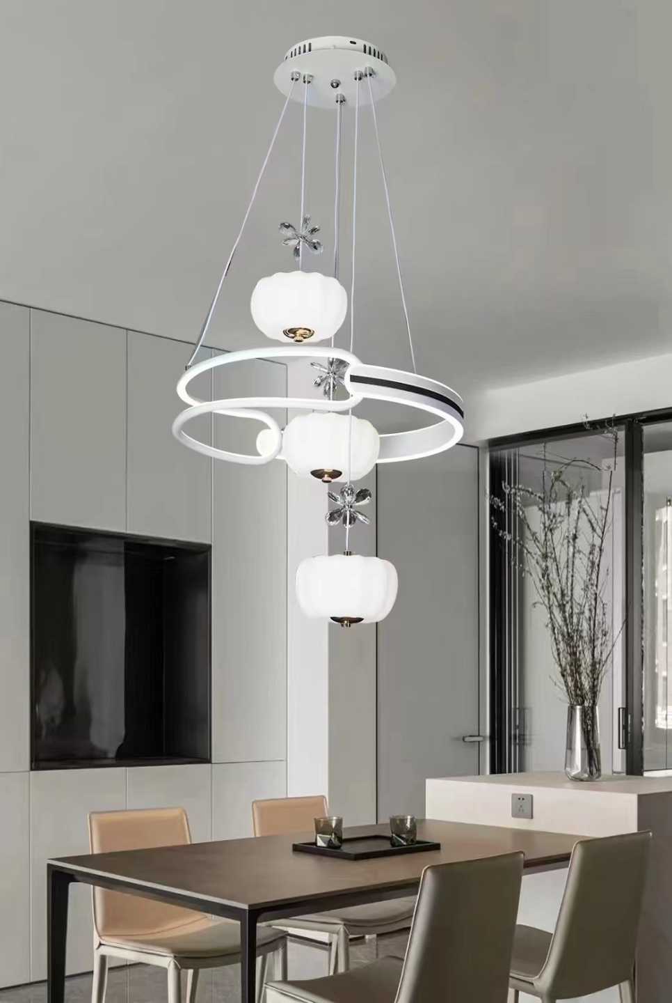 Φωτιστικό οροφής LED κρεμαστό, ιδανικό για την τραπεζαρία σας, σε εντυπωσιακό σχεδιασμό που θα προσδώσει στον χώρο σας πρωτοποριακό, μοντέρνο στυλ. Διαθέτει 3 χρωματισμούς φωτισμού και εύρος θερμοκρασίας φωτισμού 3000-6000Κ για θερμό,ψυχρό ή ουδέτερο φωτισμό, ανάλογα με τις ανάγκες του χώρου σας. Κάθε φορά που σβήνετε και ανάβετε άμεσα το φωτιστικό εμφανίζει διαφορετικό φωτισμό. Χαρακτηριστικά: Ισχύς: 70W/4800lm, Τάση: 85-260V, Διαστάσεις: 50cm (πλάτος) x 150cm (max κρεμαστό μήκος ρυθμιζόμενο)