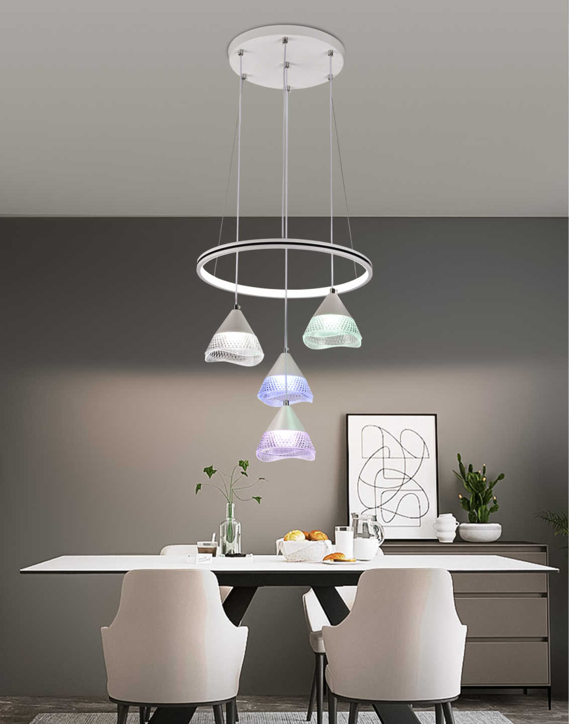 Φωτιστικό οροφής LED κρεμαστό, ιδανικό για την τραπεζαρία σας, σε εντυπωσιακό σχεδιασμό που θα προσδώσει στον χώρο σας πρωτοποριακό, μοντέρνο στυλ. Διαθέτει 3 χρωματισμούς φωτισμού και εύρος θερμοκρασίας φωτισμού 3000-6000Κ για θερμό,ψυχρό ή ουδέτερο φωτισμό, ανάλογα με τις ανάγκες του χώρου σας. Κάθε φορά που σβήνετε και ανάβετε άμεσα το φωτιστικό εμφανίζει διαφορετικό φωτισμό. Χαρακτηριστικά: Ισχύς: 70W/4800lm, Τάση: 85-260V, Διαστάσεις: 50cm (πλάτος) x 150cm (max κρεμαστό μήκος ρυθμιζόμενο)