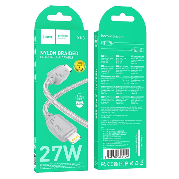 HOCO TYPE C TO LIGHTNING DATA CABLE 1m 27W X113 grey