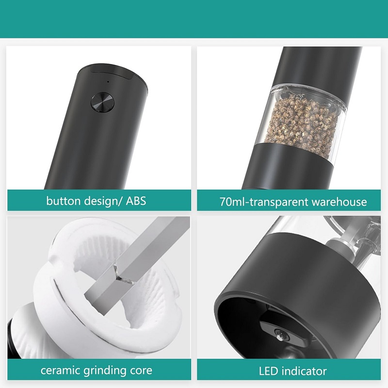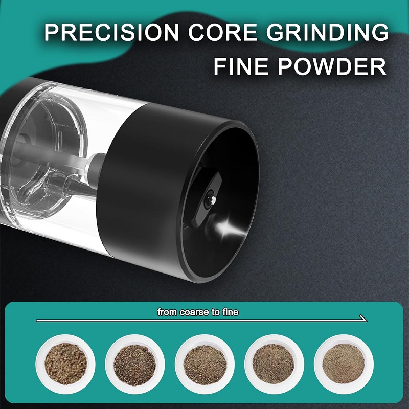Ηλεκτρικός μύλος αλατιού/πιπεριού σε κομψό σχεδιασμό με ρυθμιζόμενη ατσάλινη λεπίδα για διαφορετικά πάχη κοπής.Άμεση άλεση με το πάτημα του κουμπιού.Εργονομικό διαφανές δοχείο 70ml, για ένδειξη της στάθμης.Λυχνία LED για καλύτερη οπτική της ποσότητας κοπής. Λειτουργεί με 4 μπαταρίες ΑΑΑ (δεν περιλαμβάνονται).Διαστάσεις: 18 x 5cm.
