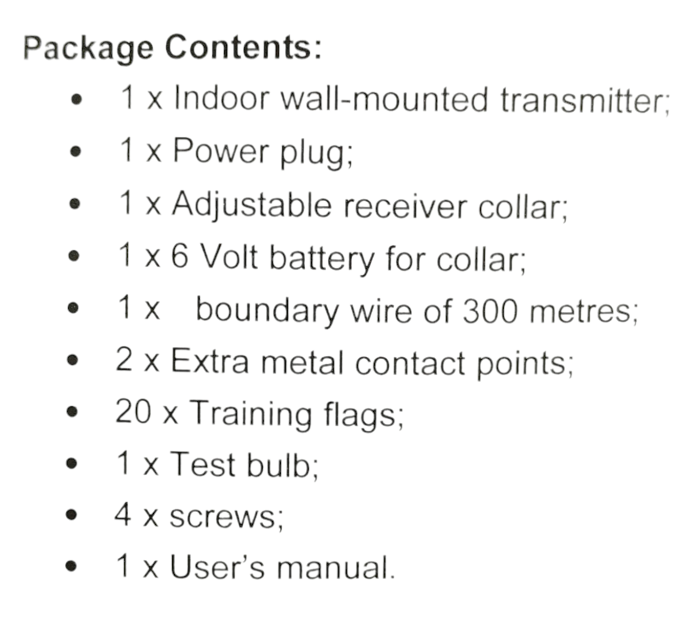 Το κρυφό σύστημα περίφραξης κατοικιδίου είναι η πιο αξιόπιστη λύση για να περιορίσετε το κατοικίδιό σας εντός μιας συγκεκριμένης περιοχής που θα έχετε οριοθετήσει εσείς οι ίδιοι.Η τοποθέτηση και η χρήση του είναι πολύ απλή. Το μόνο που έχετε να κάνετε είναι να θάψετε το καλώδιο κατά μήκος του περιγράμματος της οριοθετημένης περιοχής και να τοποθετήσετε το ειδικό κολάρο στο κατοικίδιο σας.Ένα απολύτως ασφαλές μέσο που θα πειθαρχήσει το κατοικίδιο σας αποτελεσματικά.ΧαρακτηριστικάΠαλμικό αναλογικό ερέθισμα (Όσο πιο κοντά πλησιάζει το κατοικίδιο, τόσο πιο έντονο γίνεται το ερέθισμα ου δέχεται).Προοδευτικό ερέθισμα (Ένας προειδοποιητικός ήχος ακούγεται για πρώτη φορά και αν συνεχίζει να κινείται προς το όριο ο ήχος κλιμακώνεται και δέχεται ένα ερέθισμα).Μεταβλητό πεδίο-πλάτος ελέγχου.Ηχητική και οπτική ένδειξη αν το καλώδιο σπάσει.Εντοπισμός ταχύτητας που αναπτύσει το κατοικίδιο.Ενσωματωμένη προστασία του πομπού από τους κεραυνούς.Περιεχόμενα Συσκευασίας1 Εσωτερικό επιτοίχιο πομπό (11.8 x 8.5 x 3.5 cm)1 Κολάρο δέκτη με ρυθμιζόμενο λουράκι (6.5 x 3.9 x 3.2 cm)1 Μπαταρία για το κολάρο (6 Volt 4LR44)1 Ρολό καλώδιο (300 m.)1 Τροφοδοτικό ρεύματος 12V1 Λάμπα δοκιμαστή2 Έξτρα μεγάλες αγκίδες για σκυλιά με μεγάλο τρίχωμα4 Βίδες20 Σημαίες εκπαίδευσηςΟδηγίες χρήσεως (αγγλικά)
