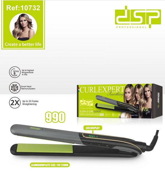 Iσιωτική μαλλιών DSP με κεραμικές πλάκες και τεχνολογία τουρμαλίνης, που προστατεύει τα μαλλιά σας από την φθορά της θερμότητας και το φριζάρισμα, προσφέροντας λείο και λαμπερό αποτέλεσμα.Χαρακτηριστικά:Ισχύς 60W, Ταχεία θέρμανση σε 1′, Ρύθμιση θερμοκρασίας 160-220 °C, Ψηφιακή οθόνη ενδείξεων LCD, Διαστάσεις πλάκας: 110*25mm, Διαστάσεις συσκευής: 275*32*30mm, Καλώδιο περιστρεφόμενο 360° – 1.9m, Σύστημα Safety Lock, Οδηγίες χρήσης στα Αγγλικά.