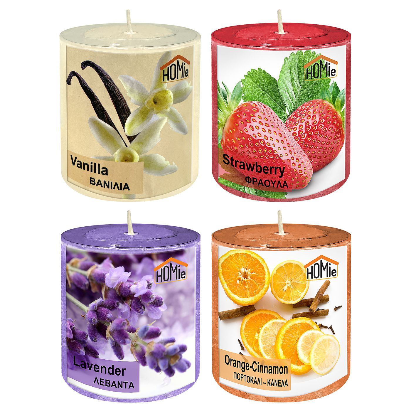 Αρωματικό. Κόκκινο=φράουλα, πορτοκαλί=πορτοκάλι-κανέλα, μώβ=λεβάντα, εκρού=βανίλια Φ6,5x7cm