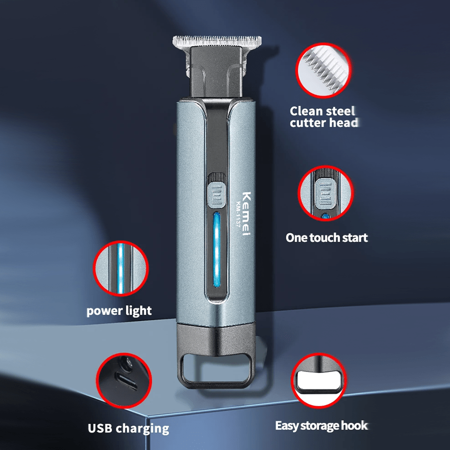 Επαναφορτιζόμενη κουρευτική μηχανή με λεπίδα ακριβείας από ανοξείδωτο ατσάλι και εντυπωσιακό design. Με μεγάλη αυτονομία μπαταρίας, εργονομικό σχεδιασμό και αξεσουάρ, κατάλληλη για κάθε είδους περιποίηση σε μαλλιά, γένια και σώμα.Χαρακτηριστικά: Ισχύς: 5W, Ρυθμιζόμενη λεπίδα, Λυχνία ένδειξης μπαταρίας, Επαναφορτιζόμενη μπαταρία λιθίου 600 mAh, Χρόνος φόρτισης: 1.5 ώρες, Χρόνος λειτουργίας: 90 λεπτά, Minimum μήκος κοπής: 0.5mm, 5 χτενάκια για διαφορετικά μήκη κοπής, Λεπίδα από ανοξείδωτο ατσάλι, πλάτους 40mm, Διαστάσεις: 4.1*16.5cm.Η συσκευασία περιλαμβάνει: 1 x Κουρευτική μηχανή, 1 x Καλώδιο φόρτισης USB, 5 x Χτενάκια οδηγοί, 1 x Βούρτσα καθαρισμού, 1 x Λαδάκι λίπανσης, 1 x Οδηγίες χρήσης στα Αγγλικά.