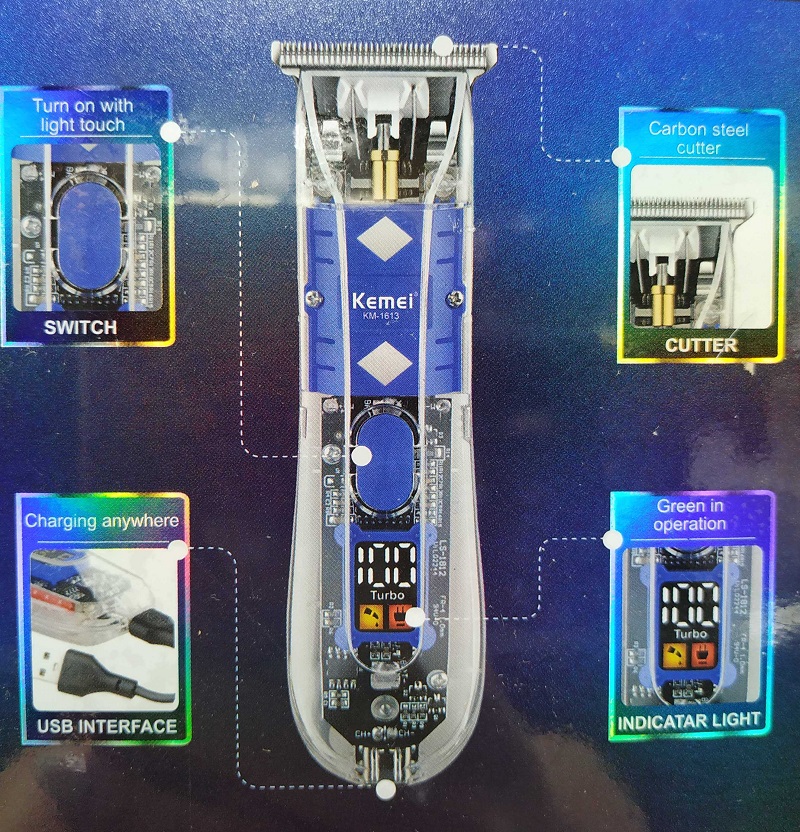 Επαναφορτιζόμενη κουρευτική μηχανή με λεπίδα ακριβείας από ανοξείδωτο ατσάλι και εντυπωσιακό διαφανές design. Mε μεγάλη αυτονομία μπαταρίας και αξεσουάρ, Ιδανική για κάθε είδους περιποίηση σε μαλλιά, γένια και σώμα. Κατάλληλη για επαγγελματική ή προσωπική χρήση.Χαρακτηριστικά: Ισχύς: 3W, Ψηφιακή οθόνη ενδείξεων, Επαναφορτιζόμενη μπαταρία λιθίου 600mah, Χρόνος φόρτισης: 2 ώρες, Χρόνος λειτουργίας: 120 λεπτά, 3 χτενάκια για μήκη κοπής 1,2,3mm, Λεπίδα από ανοξείδωτο ατσάλι πλάτους 40mm, Τεχνολογία χαμηλού θορύβου, Διαστάσεις: 15 x 4cm.Η συσκευασία περιλαμβάνει: 1 x Κουρευτική μηχανή 1 x Καλώδιο φόρτισης USB 3 x Χτενάκια/οδηγοί 1 x Βούρτσα καθαρισμού 1 x Λαδάκι λίπανσης 1 x Οδηγίες χρήσης στα Αγγλικά