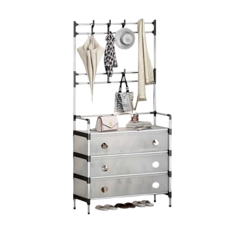 Κρεμάστρα δαπέδου με μεταλλικό σκελετό και συρταρωτές θήκες παπουτσιών και αξεσουάρ με λεπτή, πλαστική, εύκαμπτη πρόσοψη, ιδανική ως έπιπλο εισόδου ή για την οργάνωση των ρούχων στο δωμάτιό σας. Διαστάσεις: 160 x 63 x 28 cm.