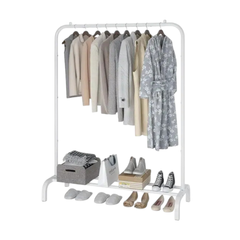 Κρεμάστρα δαπέδου μονή, μεταλλική, με ράφι παπουτσιών, ιδανική ως έπιπλο εισόδου ή για την οργάνωση των ρούχων στο δωμάτιό σας. Διαστάσεις: 150 x 110 x 40 cm.