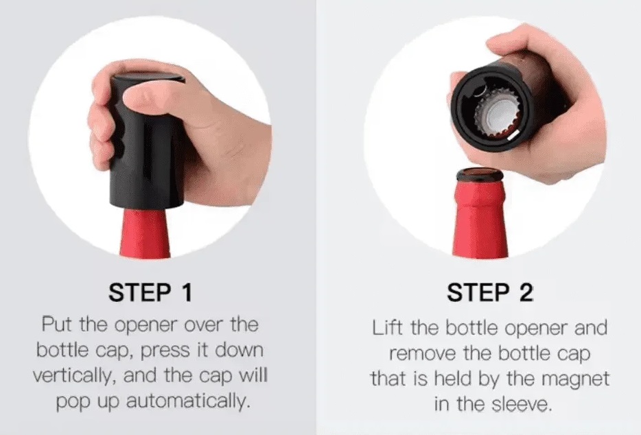 Aυτόματο ανοιχτήρι μπουκαλιών με μαγνήτη, για πανεύκολο άνοιγμα των μπουκαλιών μπύρας και αναψυκτικών με μία κίνηση: απλά τοποθετήστε το εργαλείο επάνω στο καπάκι μέχρι να κουμπώσει και τραβήξτε. Το καπάκι αφαιρείται και παραμένει μέσα χάρη στον ειδικό μαγνήτη, από όπου μπορείτε να το αφαιρέσετε χωρίς να πέσει και χωρίς να στραβώσει, ώστε να μπορείτε να το επαναχρησιμοποιήσετε. Ένα πρακτικό εργαλείο που δεν πρέπει να λείπει από την κουζίνα σας!Διαστάσεις: 16 x 5cm.