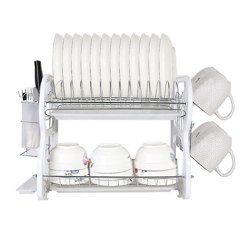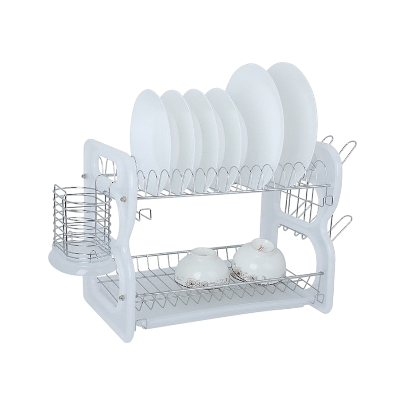 Πιατοθήκη αποστράγγισης διώροφη πλαστική με inox σκελετό, σε πρακτικό σχεδιασμό, με θήκη μαχαιροπίρουνων και βάσεις ποτηριών. Διαθέτει πλαστική βάση συγκέντρωσης νερού. Διαστάσεις (Μ-Υ-Π): 57.5 x 40 x 27 cm