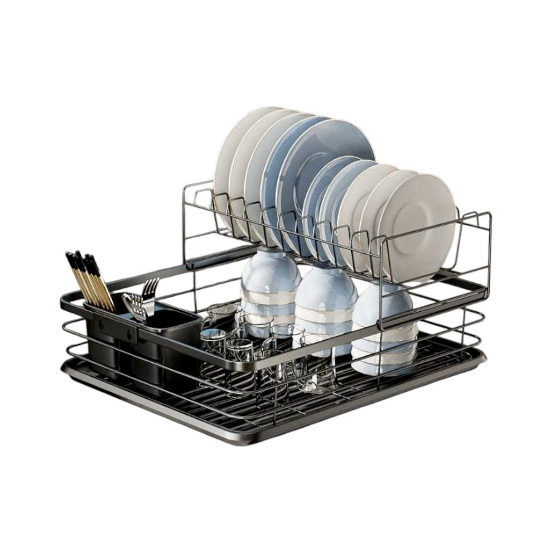 Πιατοθήκη αποστράγγισης μεταλλική, διώροφη με θήκες μαχαιροπίρουνων. Διαθέτει αφαιρούμενη και πλενόμενη πλαστική βάση συγκέντρωσης νερού.Διαστάσεις: 45 x 40 x 30cm