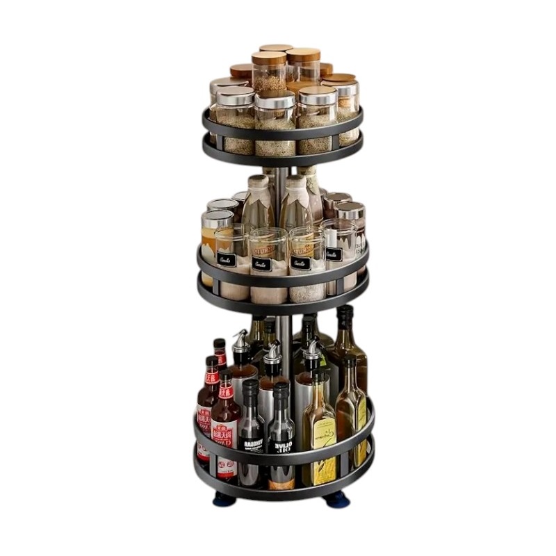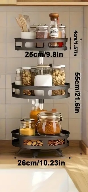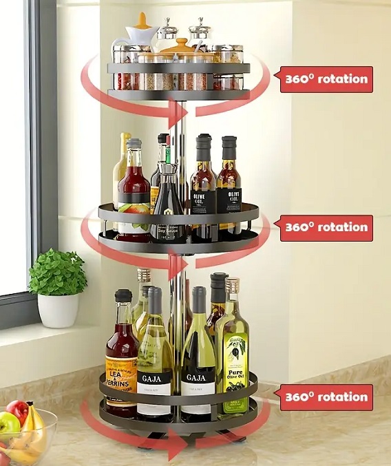 Ραφιέρα οργάνωσης πάγκου κουζίνας με μεταλλικό σκελετό, με πλαστικά ράφια περιστρεφόμενα 360 μοίρες, κατάλληλα για τρόφιμα και δοχεία, με αντιολισθητικά πατάκια για σταθερότητα και προστασία της επιφάνειας τοποθέτησης.