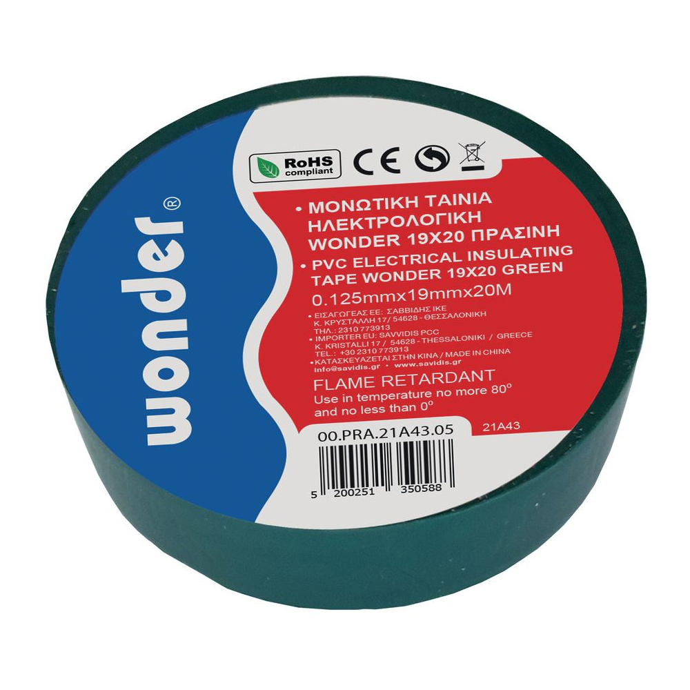 Η ταινία μονωτική πράσινου χρώματος διαστάσεων 19mm x 20m αποτελεί ανθεκτική και αδιάβροχη λύση για κάθε τεχνικό. Κατασκευασμένη από πράσινο βραδύκαυστο PVC, προσφέρει αξιόπιστη προστασία σε διάφορες εφαρμογές. Είναι ανθεκτική σε θερμοκρασίες από -40 έως +85˚C, έχει κατηγορία αντοχής στη φωτιά Β και αντέχει σε βραχυκύκλωμα έως 3kV συνεχόμενα για 1 λεπτό.