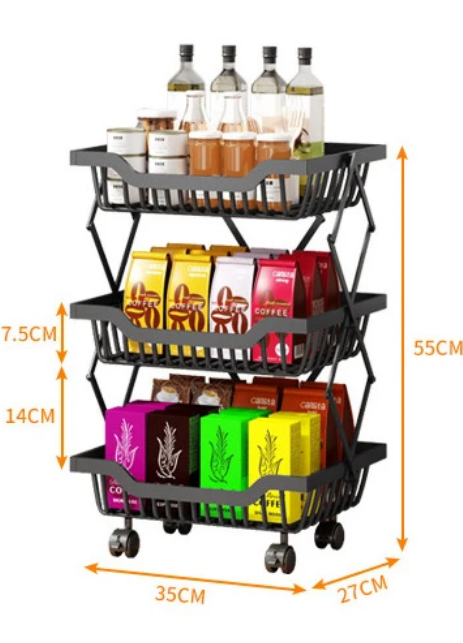 Μεταλλική ραφιέρα τριώροφη, με ρόδες για εύκολη μετακίνηση. Πτυσσόμενη για να μην καταλαμβάνει χώρο όταν δεν χρησιμοποιείται, με εργονομικό σχεδιασμό για εύκολη καθημερινή χρήση.Με ράφια μεγάλης χωρητικότητας και περιστρεφόμενες ρόδες 360° με στοπ ασφαλείας. Ιδανική για την κουζίνα, την αποθήκη, το μπαλκόνι σας ή οποιοδήποτε χώρο επιθυμείτε.Διαστάσεις: Ύψος: 55cm Ράφι: 35 x 27 x 7.5 cm.