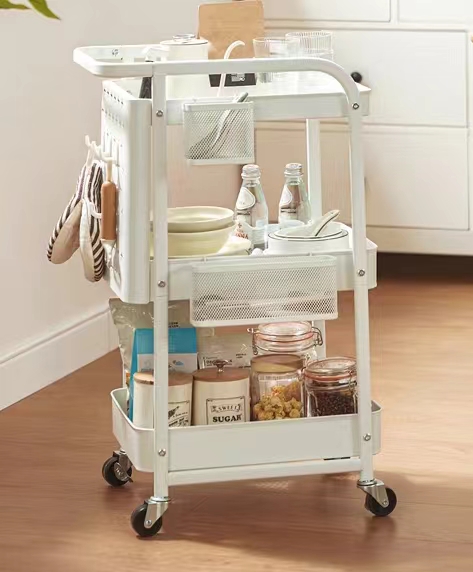 Μεταλλική, τριώροφη ραφιέρα-μανάβης, τρόλεϊ με λαβή για εύκολη μετακίνηση. Εργονομικός σχεδιασμός για εξοικονόμηση χώρου και εύκολη καθημερινή χρήση, με ράφια μεγάλης χωρητικότητας και περιστρεφόμενες ρόδες 360° με στοπ ασφαλείας.Διαθέτει ειδικά ράφια μαχαιροπίρουνων και κρεμάστρες. Ιδανική για την κουζίνα, την αποθήκη, το μπαλκόνι σας ή οποιοδήποτε χώρο επιθυμείτε.Διαστάσεις: 20 x 35 x 66cm
